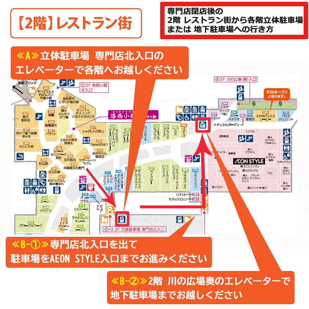 2F レストラン街から地下駐車場への行き方